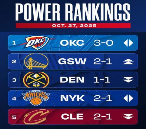 雷速体育10月28报道 NBA官方根据新赛季首周联盟各队的表现,公布了第二期球队实力榜,以下为具体名单: