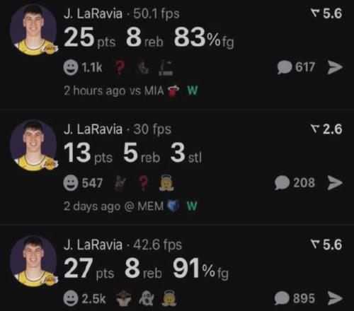 拉拉维亚在湖人三连胜期间,分别轰下27分8板2助1断、13分5板2助3断,以及25分8板3助4断,场均数据为21.7分7板2.3助2.7断,两项命中率78.1%和66.7%,真实命中率高达87.2%。