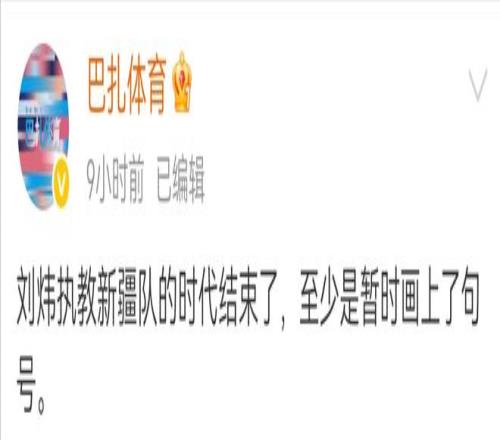 根据新疆媒体巴扎体育报道:刘炜执教新疆队的时代结束了,至少是暂时画上了句号。该媒体也是新疆男篮本地知名媒体,信息有一定的可靠度。而导火索便是客场不敌山东男篮,其中上半场仅仅得到33分,半场落后28分,而在下半场比赛有一位新疆球迷在现场拍到了,在新疆男篮大比分落后的情况下,朝着球队替补席微笑的视频,而球迷不客气的直接说道:“笑什么笑”。