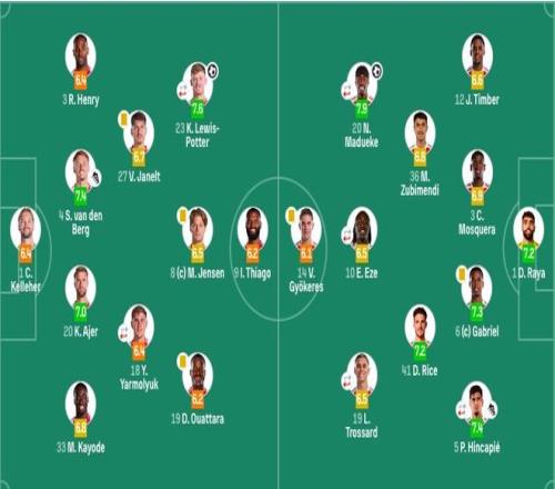 阿森纳首发:1-拉亚、3-莫斯克拉、5-因卡皮耶(81'33-卡拉菲奥里)、6-加布里埃尔、12-廷伯、10-埃泽(46'8-厄德高)、36-苏维门迪、41-赖斯、14-约克雷斯、19-特罗萨德(81'11-马丁内利)、20-马杜埃凯(70'7-萨卡)